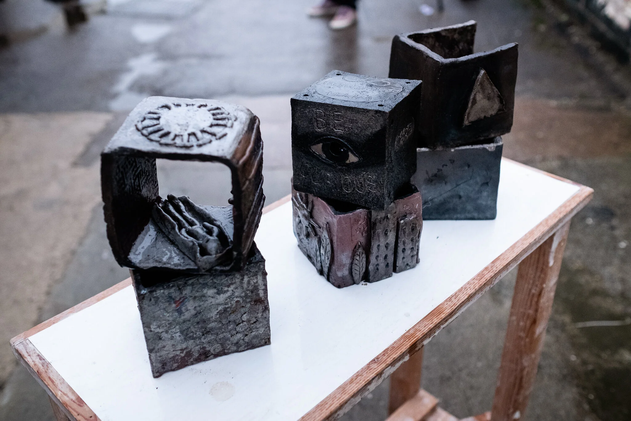 The Comrades created a series of 10 × 10 cm raku-fired ceramic cubes, each capturing personal concerns, emotions and reflections from 2020. Some were made at home during online making sessions; others were created in brief periods when small groups were able to meet in person. The work documents a community holding itself together through creativity at a time when connection felt fragile.